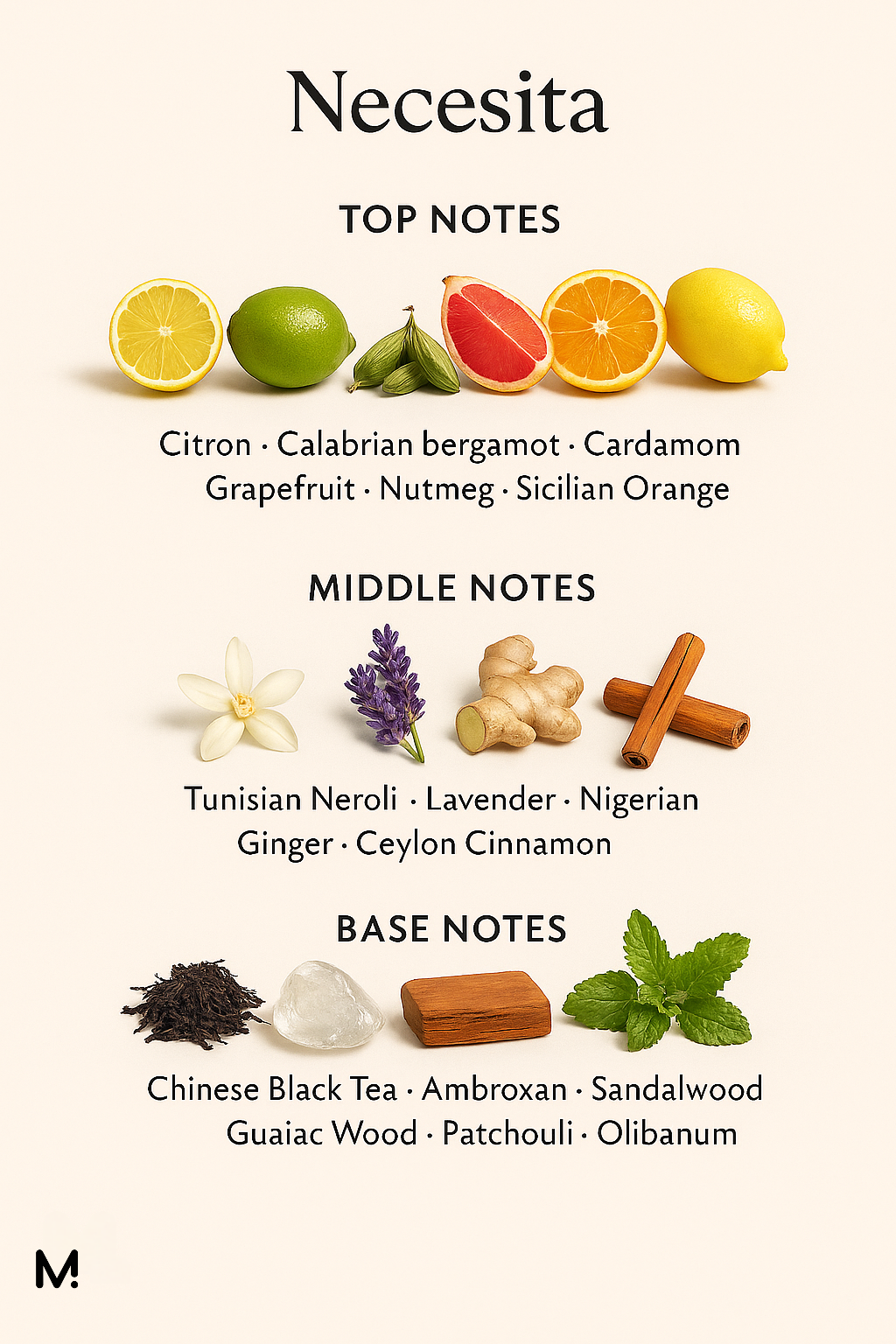 As it settles, Necesita reveals its contemplative depth. Chinese black tea, sandalwood, guaiac wood, and olibanum blend with ambroxan and patchouli—earthy, resinous, and quietly powerful.